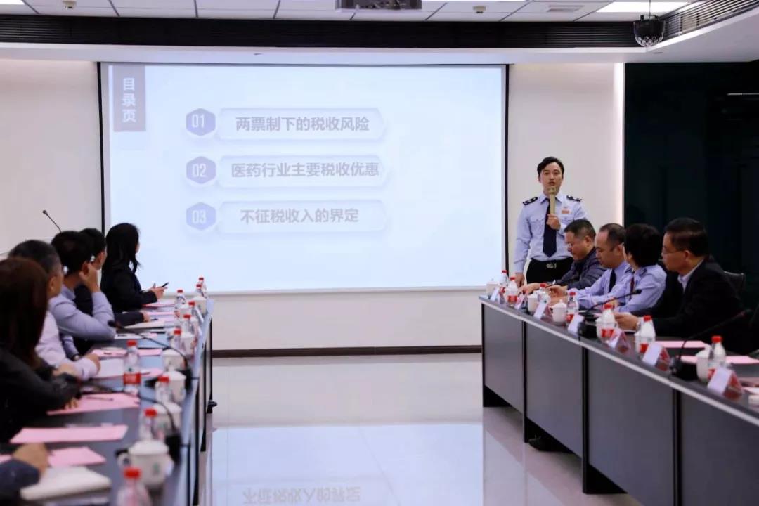 會(huì)上,開發(fā)區(qū)稅務(wù)局稅源管理一股副股長劉海山向醫(yī)藥企業(yè)代表介紹了兩票制下的稅收風(fēng)險(xiǎn)、醫(yī)藥行業(yè)主要涉及的稅收優(yōu)惠政策、不征稅收入的界定等稅收政策及醫(yī)藥企業(yè)關(guān)心的熱點(diǎn)問題。并針對(duì)醫(yī)藥行業(yè)的顯著特征,以案例分析了醫(yī)藥企業(yè)可享有的各種稅收優(yōu)惠。
