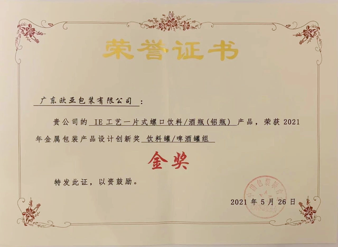 近日,在“2021年中國金屬包裝行業(yè)大會暨展覽會”上,健康基地園區(qū)企業(yè)廣東歐亞包裝有限公司(以下簡稱歐亞包裝公司)報送的“IE工藝一片式螺口飲料/酒瓶(鋁瓶)” 在眾多參評項目中脫穎而出,榮獲“2021年金屬包裝產(chǎn)品設(shè)計創(chuàng)新獎金獎”。