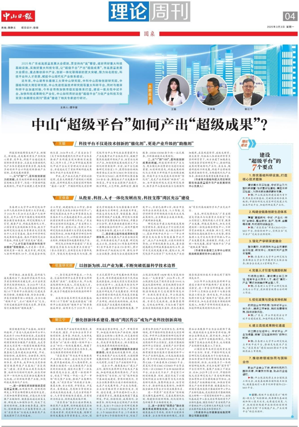 3月3日,中山日?qǐng)?bào)理論周刊刊登了訪談文章《中山“超級(jí)平臺(tái)”如何產(chǎn)出“超級(jí)成果”?》。其中,中山市健康基地集團(tuán)有限公司副總經(jīng)理郭江寧、中國(guó)檢科院大灣區(qū)研究院化妝品質(zhì)量提升與產(chǎn)業(yè)發(fā)展研究中心負(fù)責(zé)人王聰應(yīng)邀出席“圓桌”。