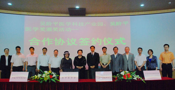 由吳階平醫(yī)學(xué)基金會(huì)、科技部火炬高技術(shù)產(chǎn)業(yè)開發(fā)中心、中山火炬區(qū)、中國(guó)科技金融促進(jìn)會(huì)風(fēng)險(xiǎn)投資專業(yè)委員會(huì)等單位共同推動(dòng)的吳階平醫(yī)學(xué)科技產(chǎn)業(yè)園和吳階平醫(yī)學(xué)獎(jiǎng)?lì)C獎(jiǎng)活動(dòng)的合作協(xié)議24日在火炬區(qū)正式簽訂。